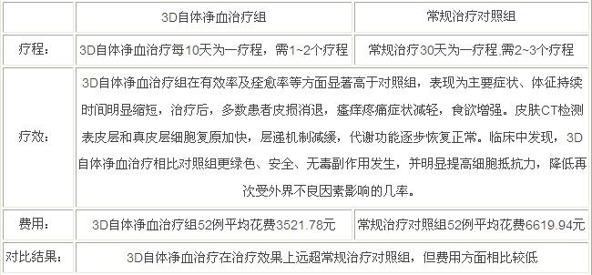医生将104位患者分为“3D自体净血治疗组”和“常规治疗对照组”进行治疗对比,对比结果如下图。